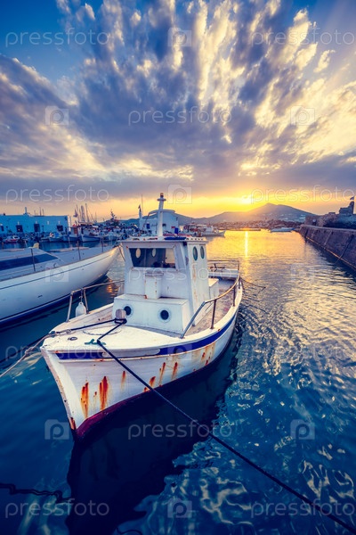 Рыболовная лодка в порту Наоузы при закате солнца. остров Парос, Греция