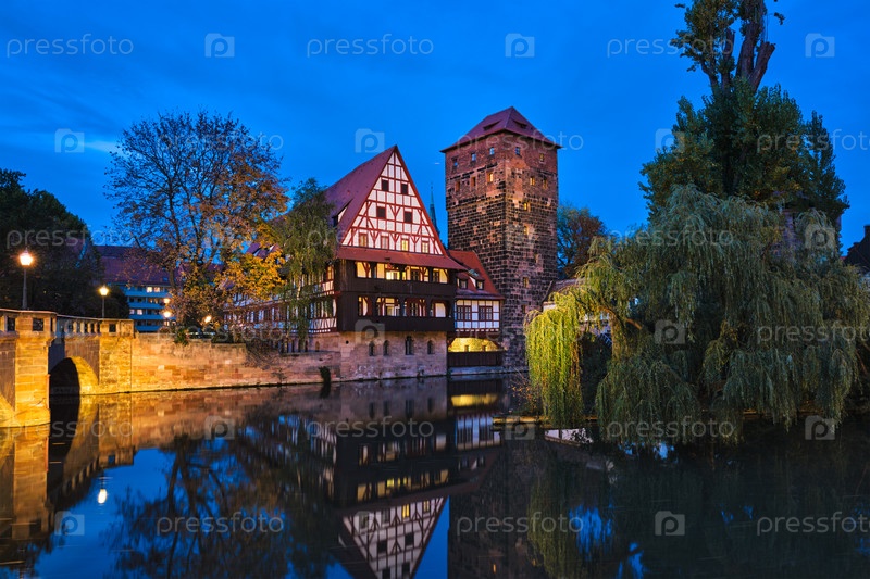 Городские дома Нюрнберга на берегу реки Пегниц.Нюрнберг, Франкония, Бавария, Германия