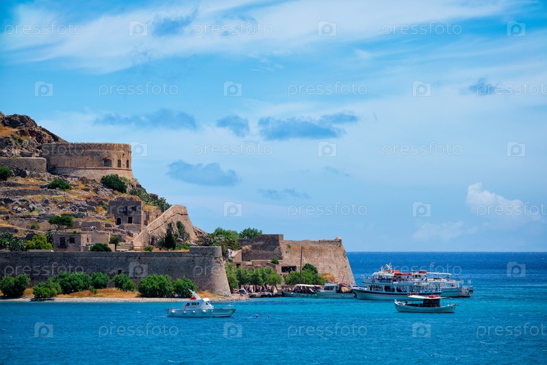 Остров Спиналонга со старой крепостью, бывшей колонией прокаженных и заливом Элунда на острове Крит, Греция