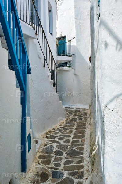 Живописные живописные узкие греческие улицы с традиционными белыми домами с голубыми окнами дверей города Миконос в знаменитой туристической достопримечательности острова Миконос, Греция