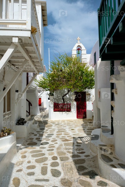 Прекрасные пейзажные узкие греческие улицы с традиционными белыми домами с голубыми дверями и окнами города Миконос и православная церковь в знаменитой туристической достопримечательности острова Миконос, Греция