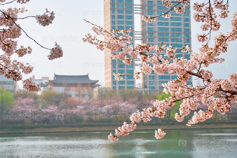 Сакура цветет с ветвью, на фоне которой небоскреб весной в Сеуле, Южная Корея