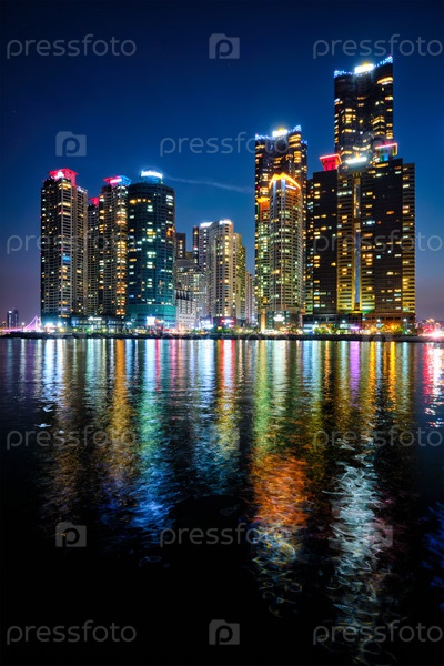 Небоскребы Пусан Марина, освещенные отражением в воде ночью, Южная Корея