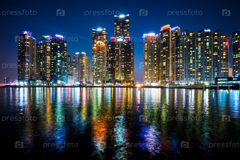 Небоскребы Бусан-Марина освещаются ночью