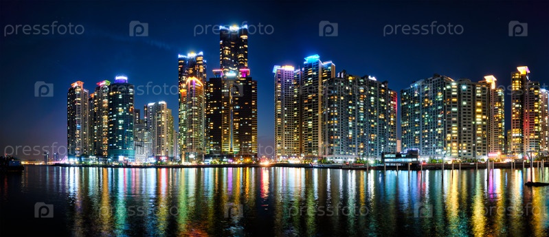 Небоскребы Бусан-Марина освещаются ночью