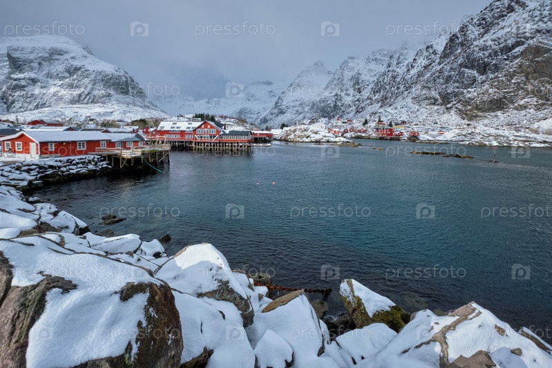 Традиционная рыбацкая деревня А на Лофотенских островах, Норвегия с домами из красного руербу