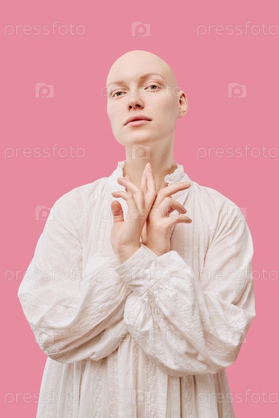 Портрет молодой взрослой женщины с алопецией, позирующей на розовом фоне