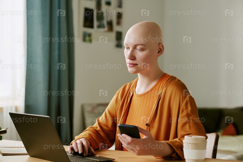 Молодая взрослая женщина с алопецией работает со смартфоном и ноутбуком