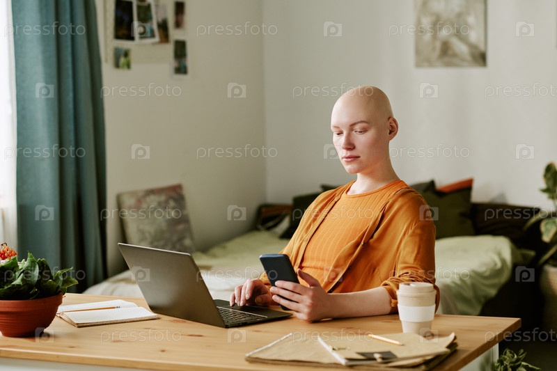Портрет молодой взрослой женщины с алопецией, проверяющей уведомления смартфона