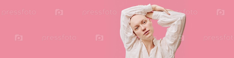 Header of Молодая взрослая женщина растягивает руки над головой с алопецией