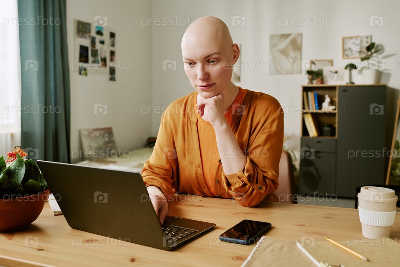 Портрет молодой взрослой женщины с алопецией, сосредоточенной на экране ноутбука