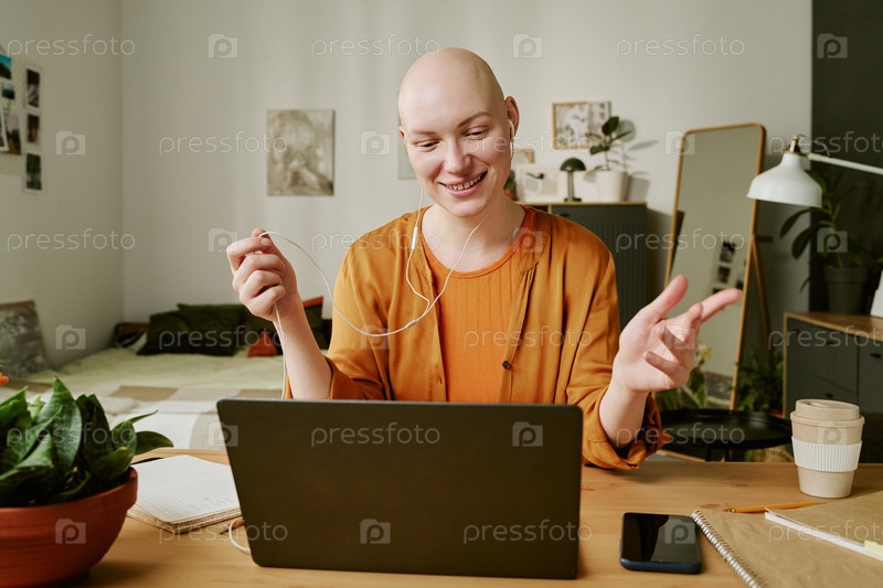 Портрет молодой взрослой женщины, улыбающейся во время видеочата в Интернете