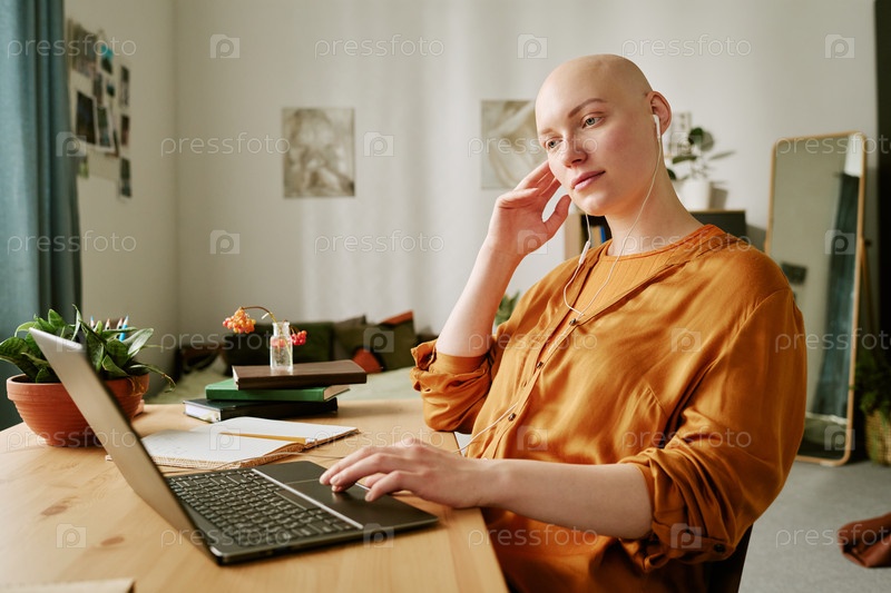 Портрет молодой взрослой женщины, испытывающей алопецию с помощью ноутбука