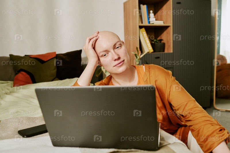 Молодая взрослая женщина с алопецией расслабляется, просматривая ноутбук в помещении
