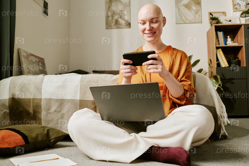 Молодая взрослая женщина с алопецией сидит на перекрестных ногах, используя смартфон