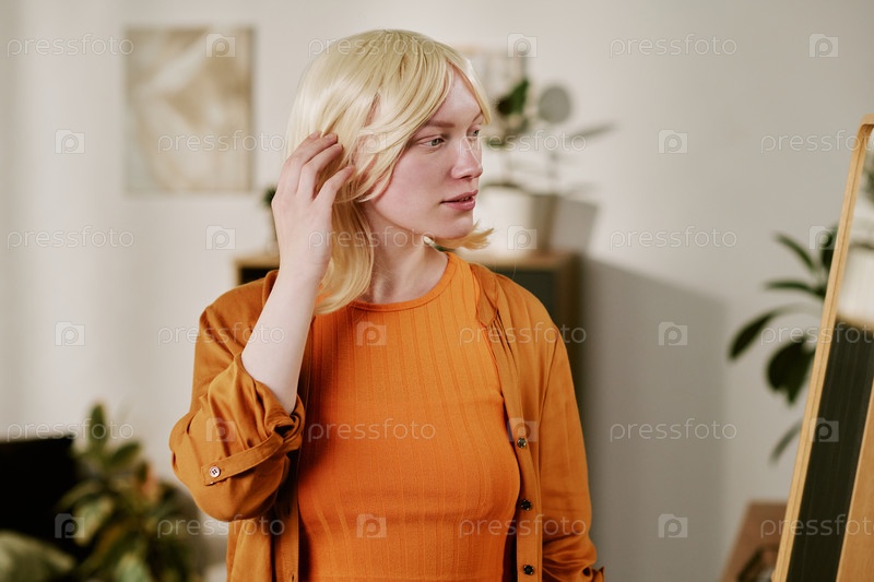 Молодая взрослая женщина корректирует блондинку, глядя в зеркало