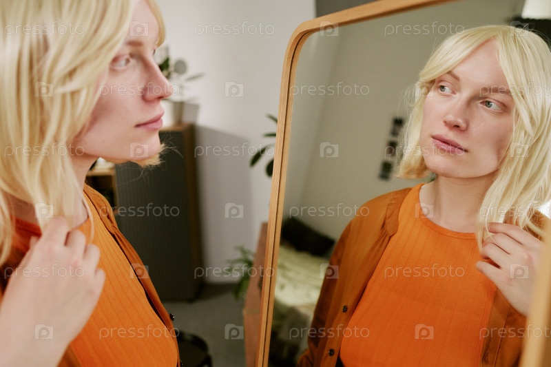 Портрет молодой взрослой женщины, изучающей выпадение волос в зеркале