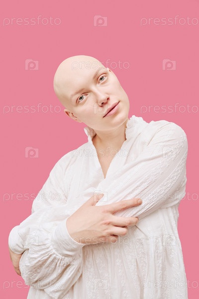 Портрет молодой взрослой женщины с алопецией пересекает руки уверенно