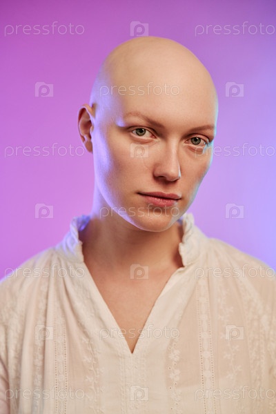 Портрет молодой взрослой женщины, испытывающей алопецию и выглядящей уверенно
