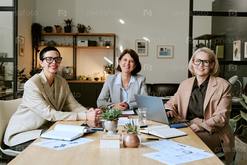 Три деловых женщины среднего возраста, улыбающиеся во время совместного планирования проекта