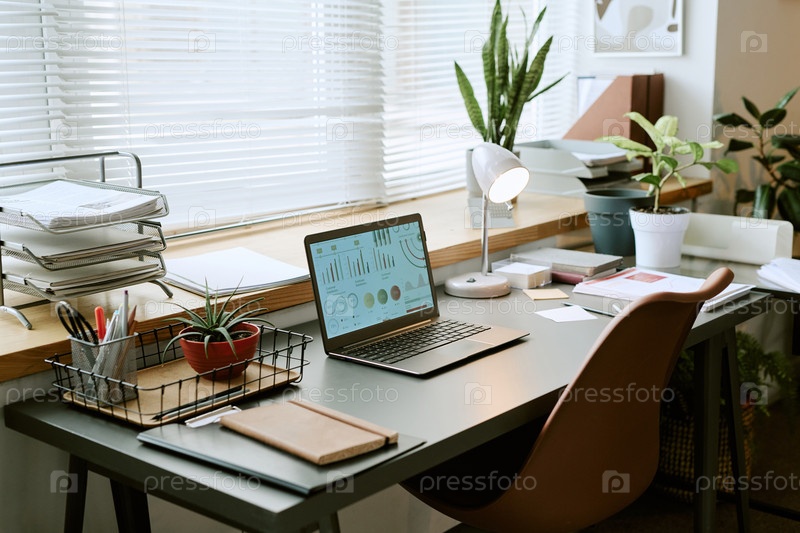 Домашний офисный стол с ноутбуком, отображающий современные графики бизнес-аналитики