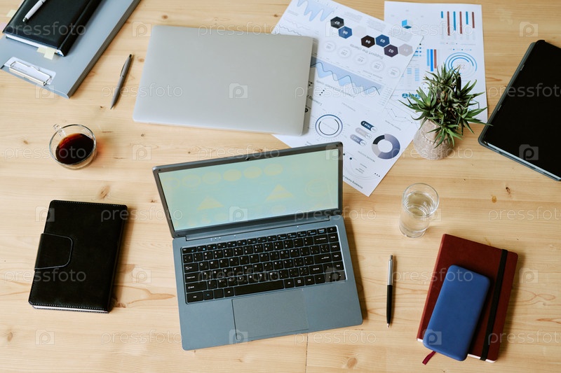 Общий вид ноутбука и деловых документов, расположенных на офисном столе