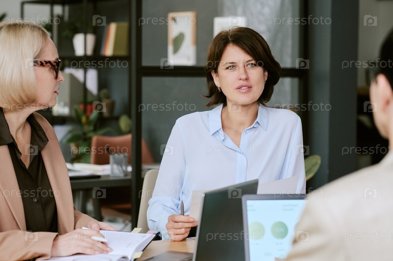 Женщина средних лет, ведущая деловую встречу с различными коллегами