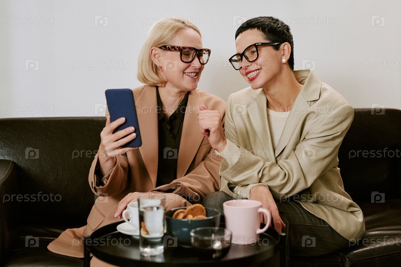 Женщины среднего возраста улыбаются и разговаривают, используя смартфон в помещении
