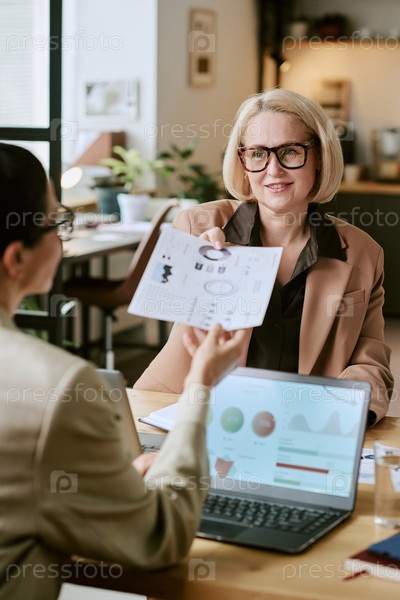Женщина средних лет обсуждает бизнес-отчет с молодой взрослой женщиной