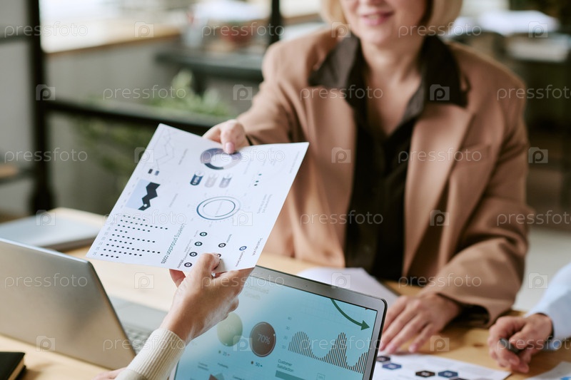 Женщина среднего возраста передает бизнес-отчет во время офисной встречи