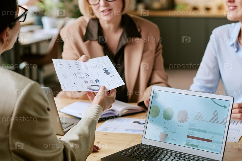 Женщины среднего возраста, разделяющие печатную аналитику во время офисной совместной работы
