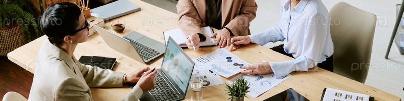 Три женщины среднего возраста обсуждают бизнес-стратегию за столом
