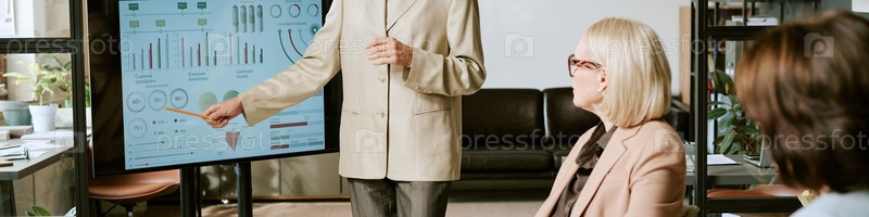 Мужчина средних лет, представляющий бизнес-данные женщинам среднего возраста