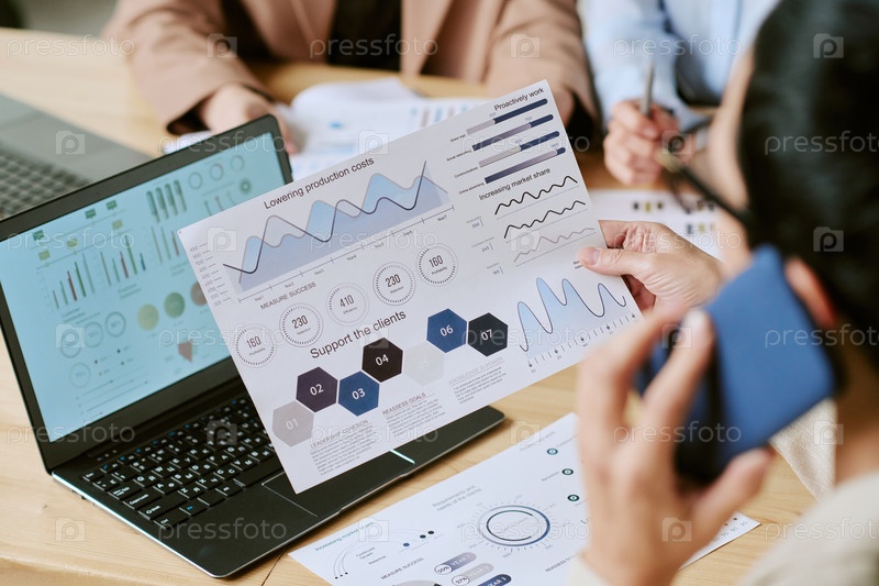 Молодая взрослая азиатская женщина анализирует финансовые графики, разговаривая со смартфоном