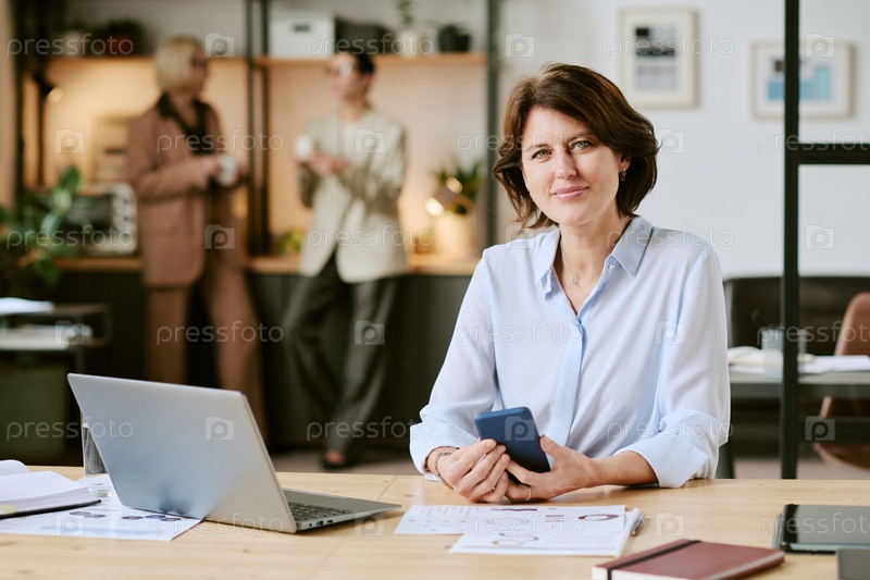 Портрет женщины среднего возраста, сидящей за рабочим столом и использующей смартфон в офисе