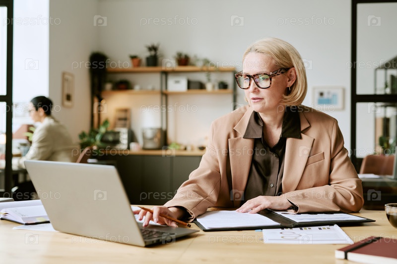 Женщина средних лет работает на ноутбуке и просматривает документы в помещении