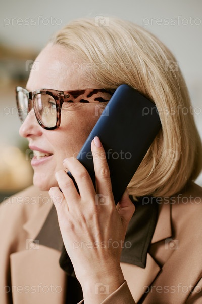 Женщина среднего возраста разговаривает со смартфоном во время делового разговора