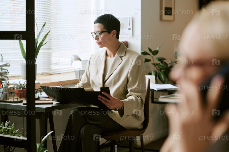 Женщина среднего возраста просматривает документы, сидя за рабочим столом