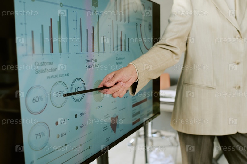 Мужчина средних лет представляет бизнес-аналитику на интерактивном экране