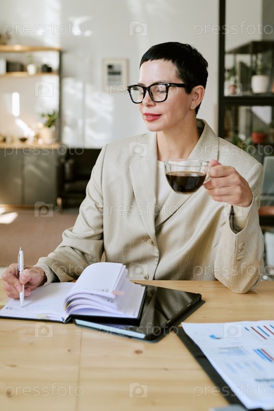 Женщина средних лет пишет записки, выпивая кофе за столом