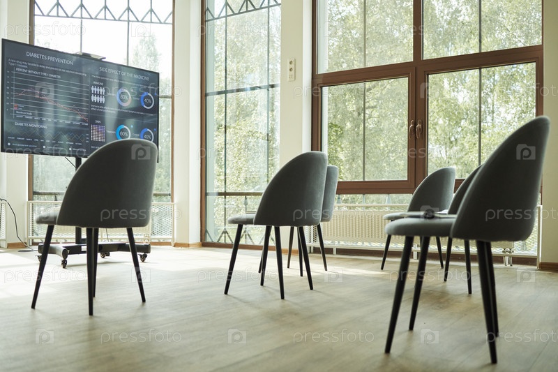Пустой конференц-зал с цифровым экраном, показывающий медицинскую презентацию