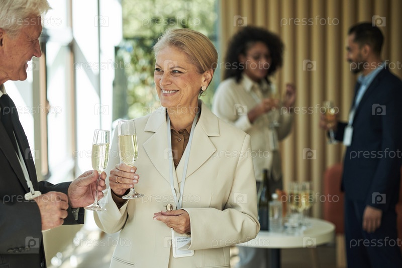 Старшая женщина улыбается, выпивая шампанское на деловом мероприятии