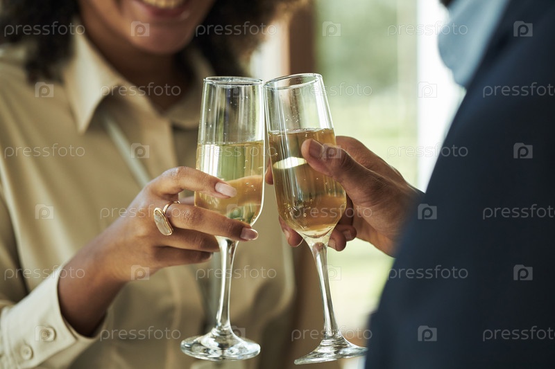 Молодая мультиэтническая пара молодых взрослых тостирует шампански во время празднования