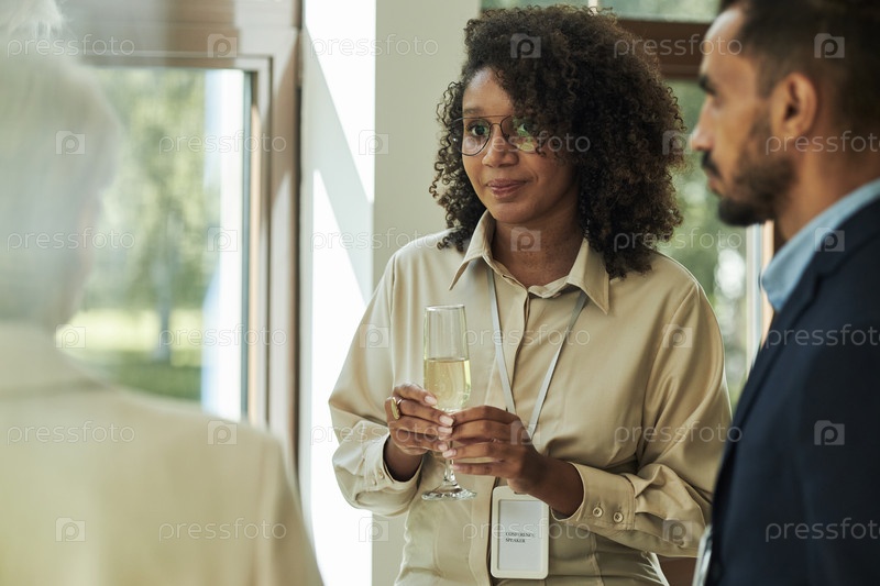 Молодая взрослая чернокожая женщина держит бокал шампанского во время сетевого общения в помещении