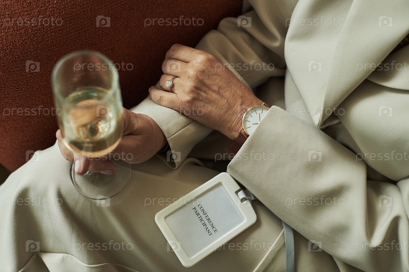 Женщина среднего возраста, посещающая конференцию, держащая бокал вина
