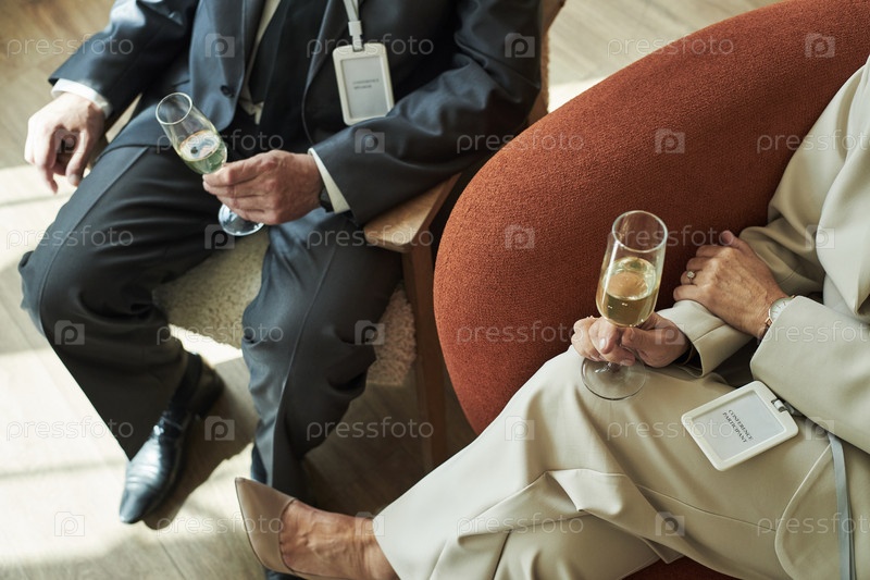 Мужчина и женщина средних лет посещают деловое мероприятие, пьют шампанское