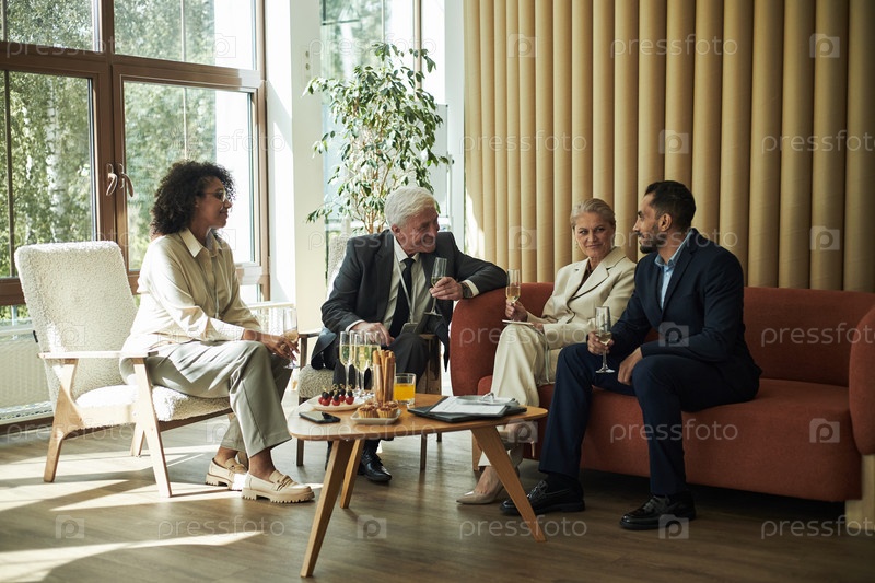 Разнообразная группа взрослых среднего и старшего возраста, общающихся в современной гостиной