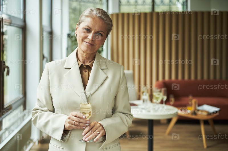 Портрет пожилой женщины, улыбающейся в то время как она держит стакан на приеме
