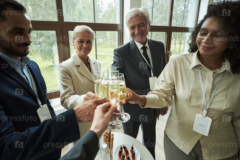 Разнообразные бизнес-профессионалы среднего возраста, выпивающие шампанским бокалом