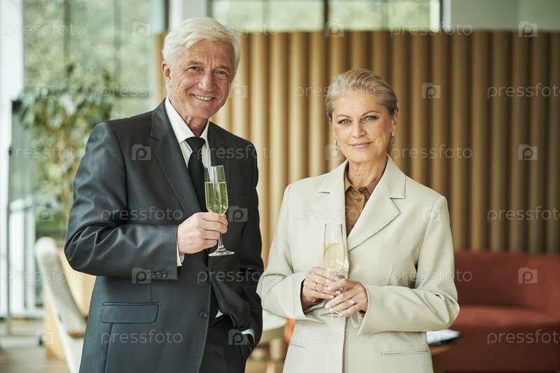 Мужчина и женщина-старший улыбаются, держа чашки шампанского в помещении